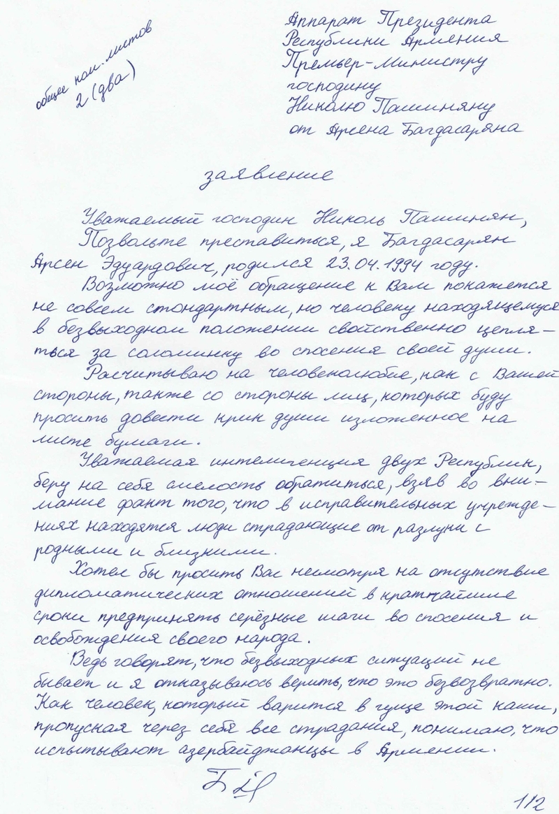 В сообщении Госкомиссии по делам военнопленных, заложников и без вести пропавших граждан Азербайджана говорится, что армянский военный Багдасарян Арсен Эдуардович (1994 года рождения) обратился к Николу Пашиняну об освобождении заложников по принципу «всех на всех».