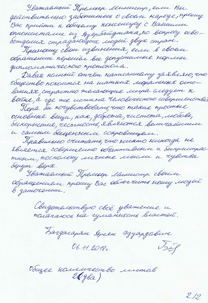 Багдасарян попросил Госкомиссию по делам военнопленных, заложников и без вести пропавших граждан Азербайджана обнародовать написанное им обращение.