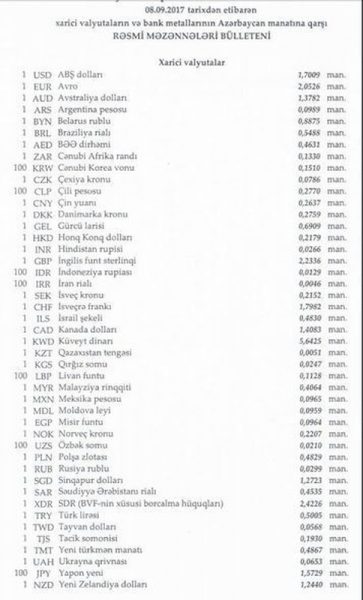 Согласно информации, опубликованной в бюллетене Центробанка за 8 сентября 2017 года, официальный курс доллара составил 1,7009 маната. Курс евро, входящего в бивалютную корзину, составил 2,0526 маната.