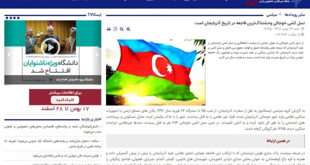 На иранском новостном портале рассказывается о Ходжалинском геноциде, о том, что армянские вооруженные формирования, захватив город Ходжалы, учинили геноцид против мирного азербайджанского населения.