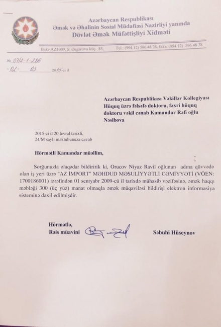 В ответ на запрос адвоката Кямандара Насибова замначальника Службы трудовой инспекции Министерства труда и социальной защиты Сабухи Гусейнов 20 февраля 2015 года наконец раскрывает информацию о таинственной личности владеющего самыми дорогостоящими новостройками в центре Баку: «Оруджев Нияз Равиль оглу, который с 1 сентября 2009 года занимает должность бухгалтера компании AzImport и его ежемесячный оклад составляет 300 манатов». Прекрасно!