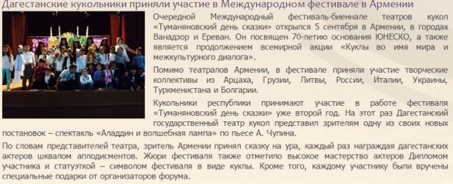 Как сообщает AZE.az, на сайте Министерства культуры Республики Дагестан опубликована информация от 9 сентября 2015 года «Дагестанские кукольники приняли участие в Международном фестивале в Армении», в которой говорится: «…Помимо театралов Армении, в фестивале приняли участие творческие коллективы из Арцаха, Грузии, Литвы, России, Италии, Украины, Туркменистана и Болгарии».