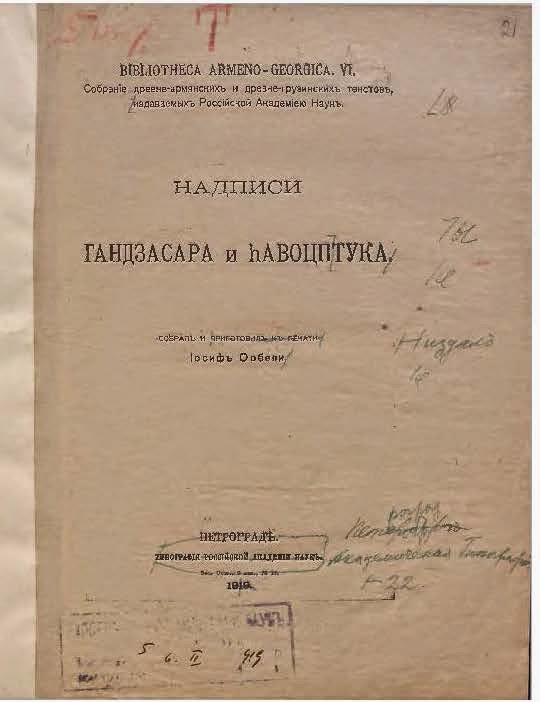 Именно этой особой позиции И.Орбели относительно древнего наследия Кавказской Албании и его уничтоженной книге «Надписи Гандзасара и hавоцптука» [4] посвящены многолетние исследования азербайджанского политолога Фуада Ахундова и группы ученых под его руководством. По итогам своих исследований эпиграфических надписей в храмах и на памятниках в Карабахе, И.Орбели готовил к печати свой труд. В 1919 году ученый Санкт-Петербургской Императорской Академии Наук подготовил книгу И.А. Орбели «Надписи Гандзасара и hавоцптука». Но затем произошло что–то странное, о чем свидетельствует письмо И.Орбели от 9 января 1922 года, адресованное им Петербургской Академии. [8]