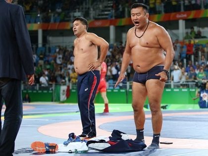 Тренеры монгольского борца в знак протеста разделись перед судейским столиком до трусов, а их подопечный отказался участвовать в церемонии поднятия руки победителя.