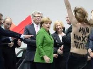 Активистки украинского движения Femen разделись до пояса перед Владимиром Путиным и Ангелой Меркель, когда те осматривали стенд Volkswagen на ярмарке в Ганновере