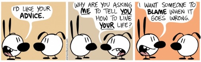 "Мне нужен твой совет". — "Почему ты просишь меня сказать тебе, как проживать твою жизнь?" — "Я хочу, чтобы было кого винить, когда все пойдет не так"«Мне нужен твой совет». — «Почему ты просишь меня сказать тебе, как проживать твою жизнь?» — «Я хочу, чтобы было кого винить, когда все пойдет не так». Фото: medium.com/@cammipham