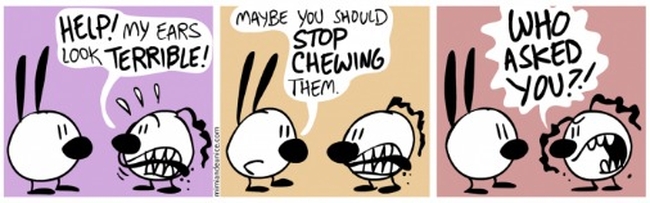 "Помоги! Мои уши выглядят ужасно!" — "Может, пора перестать их жевать?" — "Тебя никто не спрашивал!"«Помоги! Мои уши выглядят ужасно!» — «Может, пора перестать их жевать?» — «Тебя никто не спрашивал!».