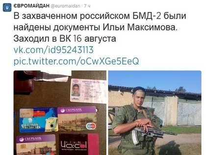 В микроблоге движения Евромайдан в Twitter появились фотографии документов, обнаруженных внутри БМД-2. Авторы микроблога утверждают, что их владелец — десантник из Пскова Илья Максимов. Они также приводят ссылку на его страницу «ВКонтакте» и отмечают, что последний раз он заходил в соцсеть 16 августа.