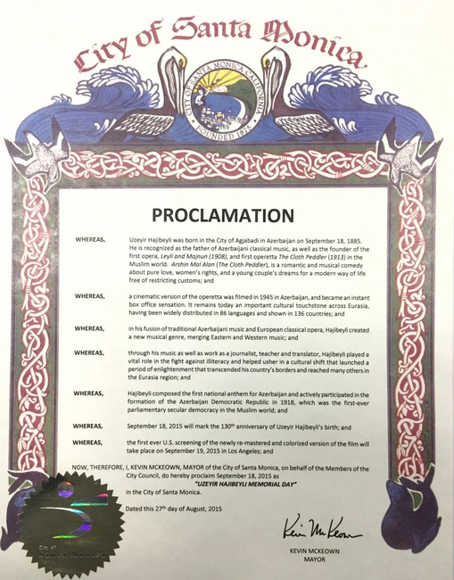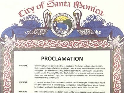 Как сообщили AZE.az в генеральном консульстве Азербайджанской Республики в Лос-Анджелесе, специальную декларацию по этому поводу подписал мэр города Санта-Моника Кевин Маккион, который расположен рядом с Лос-Анджелесом и в котором проживают многие голливудские звезды и режиссеры.
