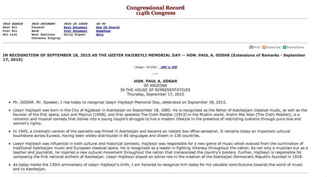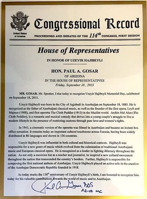 Американский конгрессмен отметил, что дата 18 сентября признана «Днем Узеира Гаджибейли». Пол Госар проинформировал конгрессменов о роли композитора в формировании классической музыки в Азербайджане, в том числе историко-культурного наследия.
