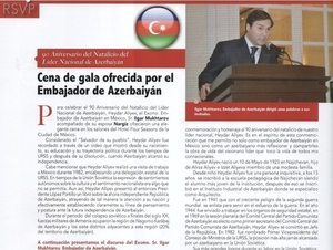 В статье, опубликованной в связи с 90-летием Гейдара Алиева, рассказывается о торжественном приеме в честь этой даты. Сообщается, что мероприятие открыл посол Азербайджана Ильгар Мухтаров. Статья называется «Посол Азербайджана провел праздничный ужин в честь 90-летия общенационального лидера Гейдара Алиева».