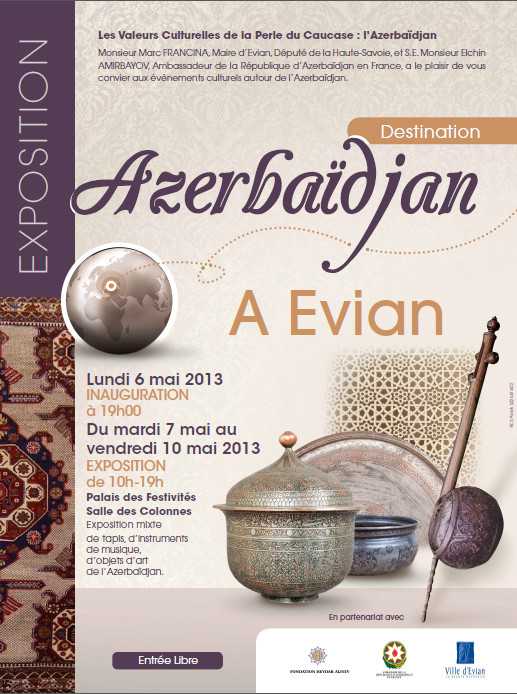 Как передает AZE.az, выставка, на которой представлены роскошные ковры, традиционные музыкальные инструменты и изделия народных промыслов Азербайджана, организована совместно Фондом Гейдара Алиева, Посольством Азербайджана во Франции и мэриями различных французских городов. После торжественной инаугурации в октябре прошлого года в Реймсе в присутствии первой дамы республики, она объехала уже 12 городов, от небольших, как Ниорт, до крупнейших, как Бордо. Задержавшись в Эвиане всего на четыре дня, она двинется дальше.