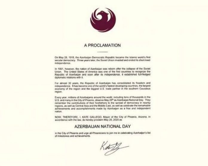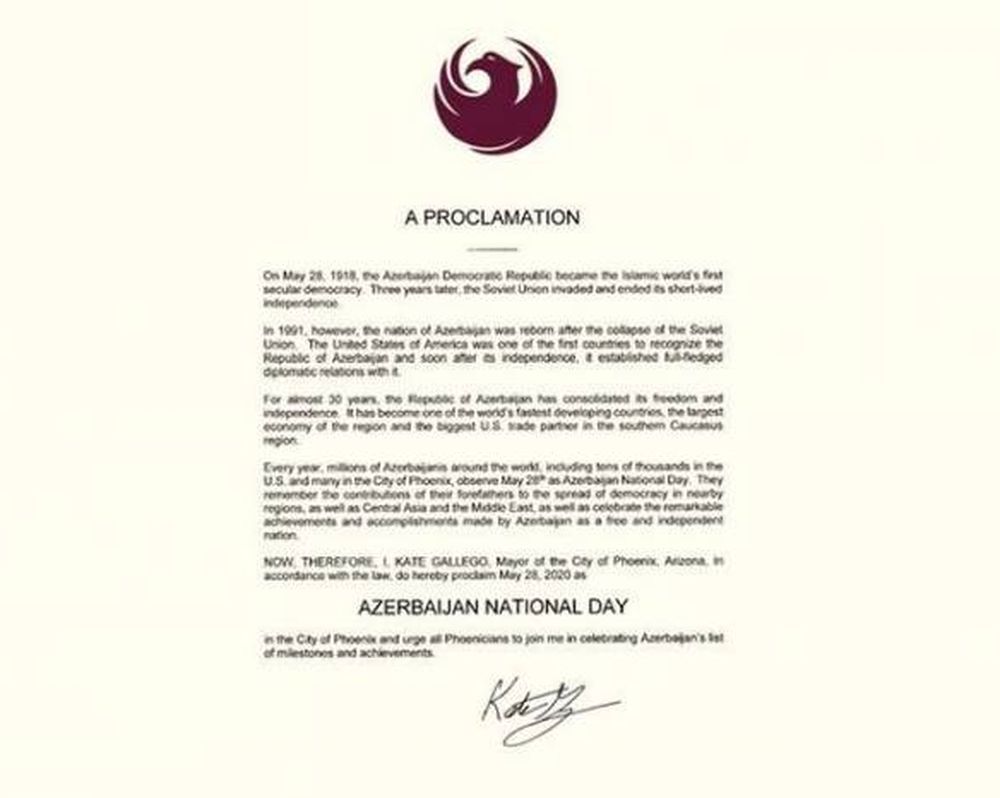 По словам мэра города, день 28 мая объявлен в городе Финикс «Национальным днем Азербайджана», жителей города призвали отметить этот праздник и успехи Азербайджана.