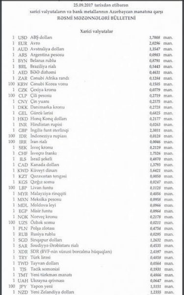 Согласно информации, опубликованной в бюллетене Центробанка за 25 сентября 2017 года, официальный курс доллара составил 1,7008 маната. Курс евро, входящего в бивалютную корзину, составил 2,0296 маната.