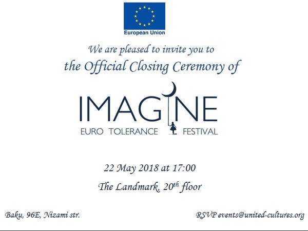 Как передает AZE.az, фестиваль IMAGINE Euro Tolerance Festival 2018 успешно завершил свою работу. Официальная церемония закрытия Международного фестиваля толерантности IMAGINE 2018 состоится 22 мая, в 17:00, в Landmark, 20 этаж.